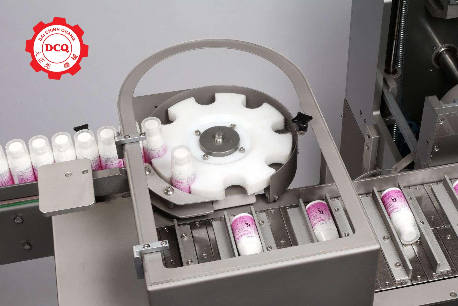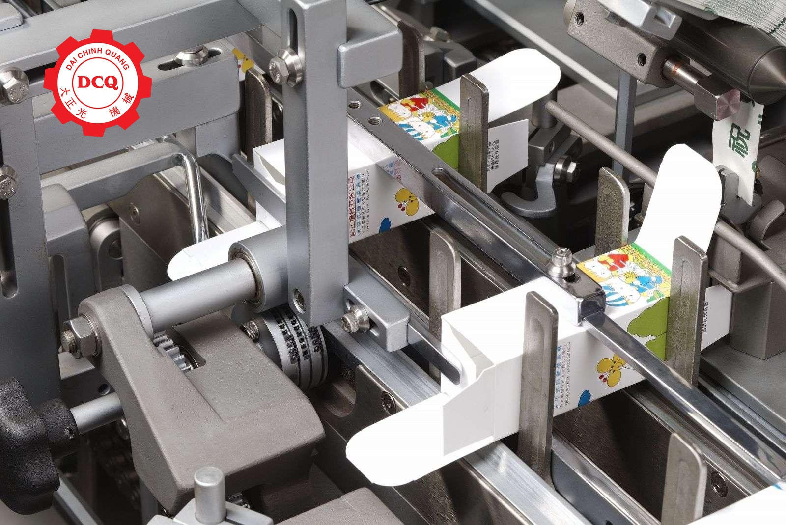 Nguyên lý hoạt động: Sau khi hộp được mở ra, sản phẩm được đẩy vào trong hộp một cách mượt mà mà không làm hỏng vật trong hộp. Các quy trình từ tạo hình hộp, cho vật vào, chèn hướng dẫn sử dụng, in số lô và ngày sản xuất đều được thực hiện nhất quán.Mâm sao dùng để tách và định vị sản phẩm, đưa hướng dẫn sử dụng vào.
