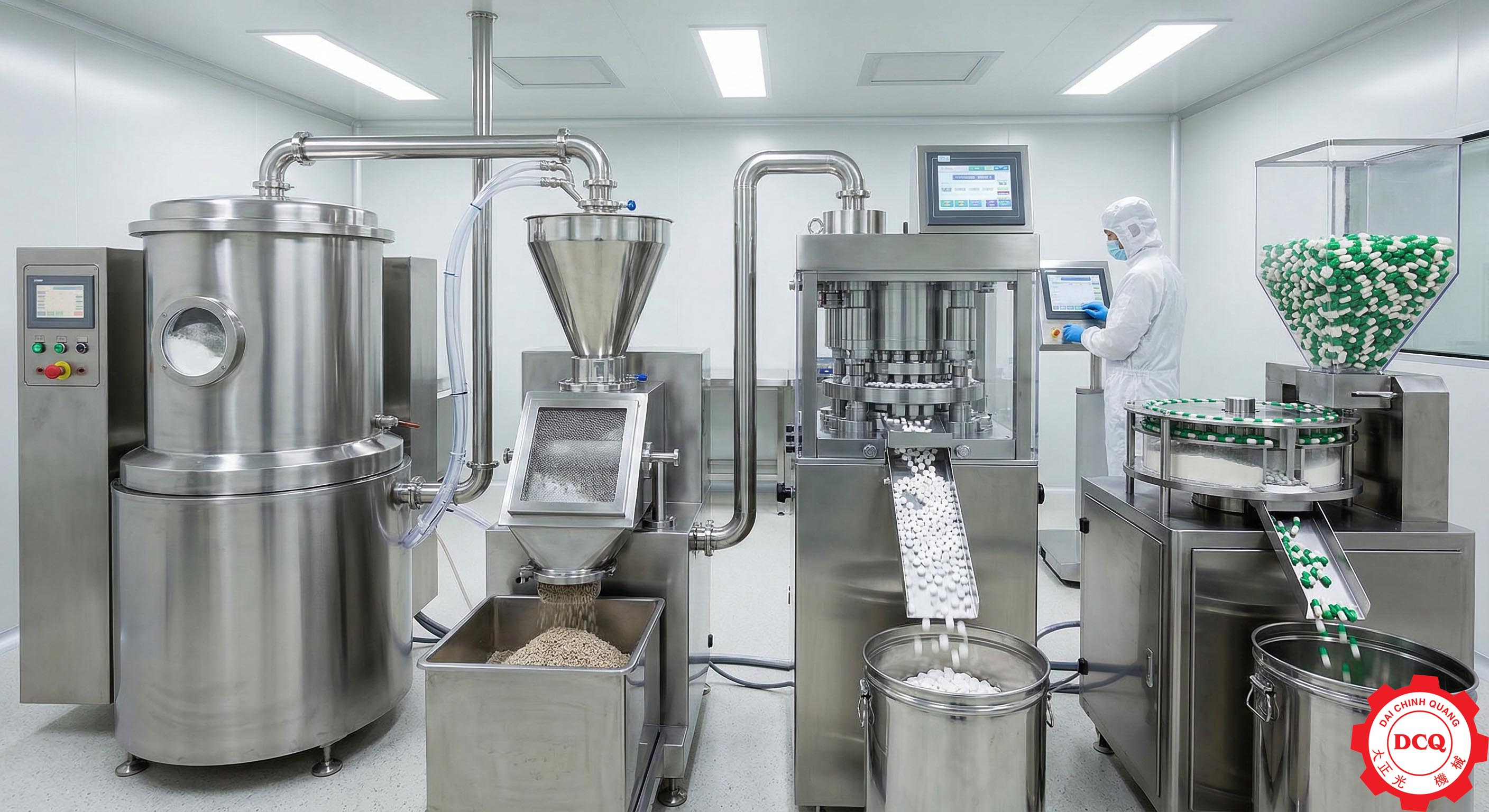 Dây chuyền sản xuất thuốc viên (Viên nén, viên nang): Cung cấp hệ thống máy trộn bột tốc độ cao, máy tạo hạt, máy dập viên, máy đóng nang tự động. Các thiết bị đều được làm từ inox SUS304/SUS316 cao cấp, đảm bảo không gỉ sét và dễ dàng vệ sinh.