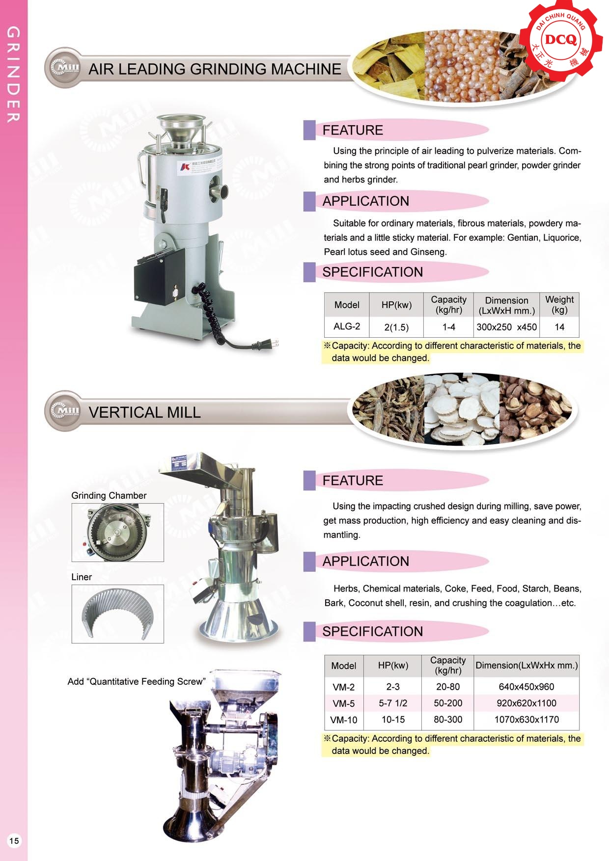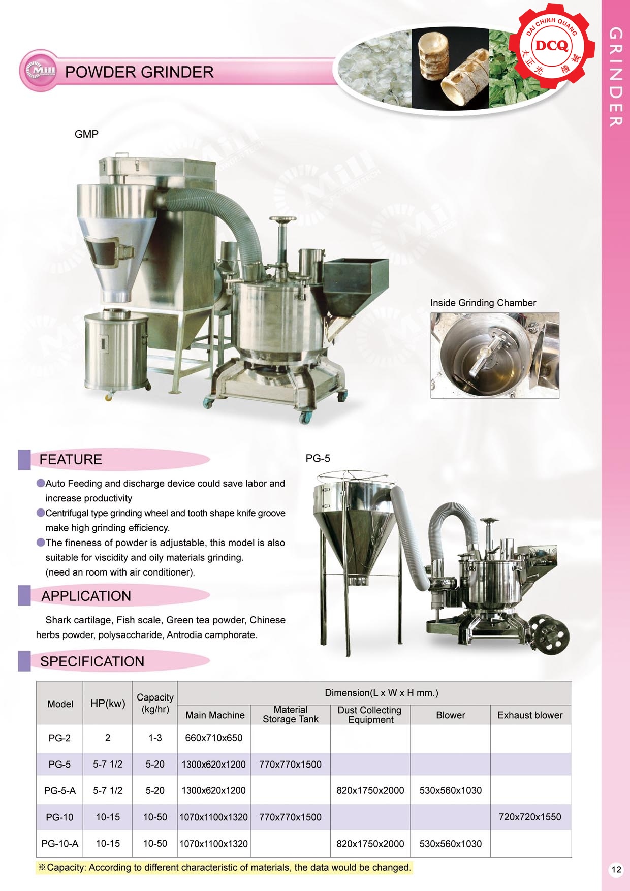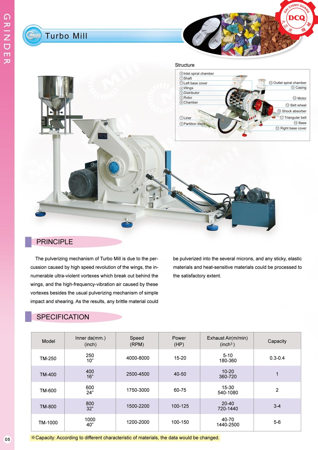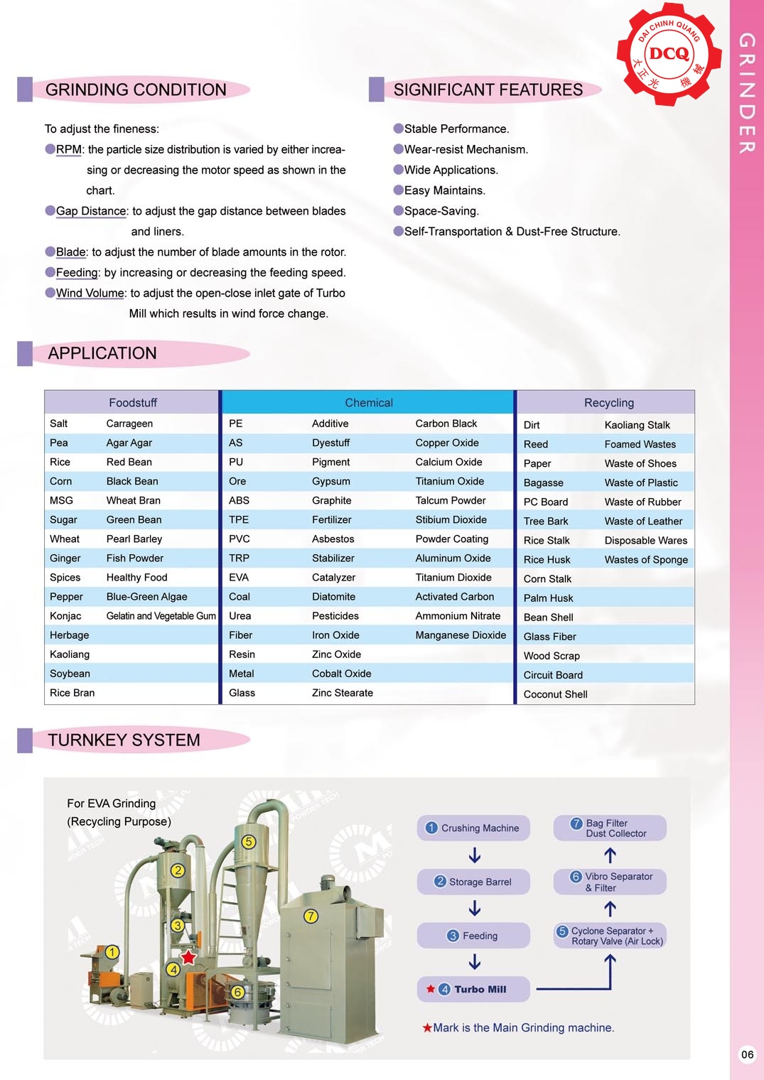 Máy nghiền siêu mịn (Turbo Mill): Thiết bị xử lý nguyên liệu thành bột mịn đạt kích thước micron. Đặc biệt hiệu quả với các vật liệu giòn, dính, đàn hồi hoặc nhạy cảm với nhiệt độ. Ứng dụng rộng rãi để nghiền gạo, ngô, đường, muối, gia vị, hạt tiêu, các loại đậu, tảo biển và gelatin.