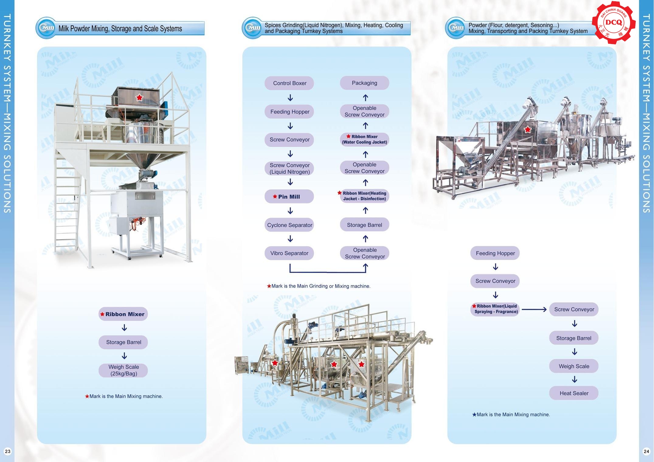 Dây chuyền nghiền, trộn và đóng gói gia vị với Nitơ lỏng: Nguyên liệu từ phễu nạp được băng tải trục vít đưa qua hệ thống làm lạnh bằng Nitơ lỏng trước khi vào máy nghiền chốt (Pin Mill). Bột sau khi nghiền đi qua hệ thống lọc xoáy (Cyclone) và rây rung để phân loại kích thước. Tiếp đó, bột được đưa vào máy trộn ruy-băng có gia nhiệt để khử trùng, đi qua máy trộn làm mát bằng nước và cuối cùng xả vào thùng chứa chờ đóng gói.
