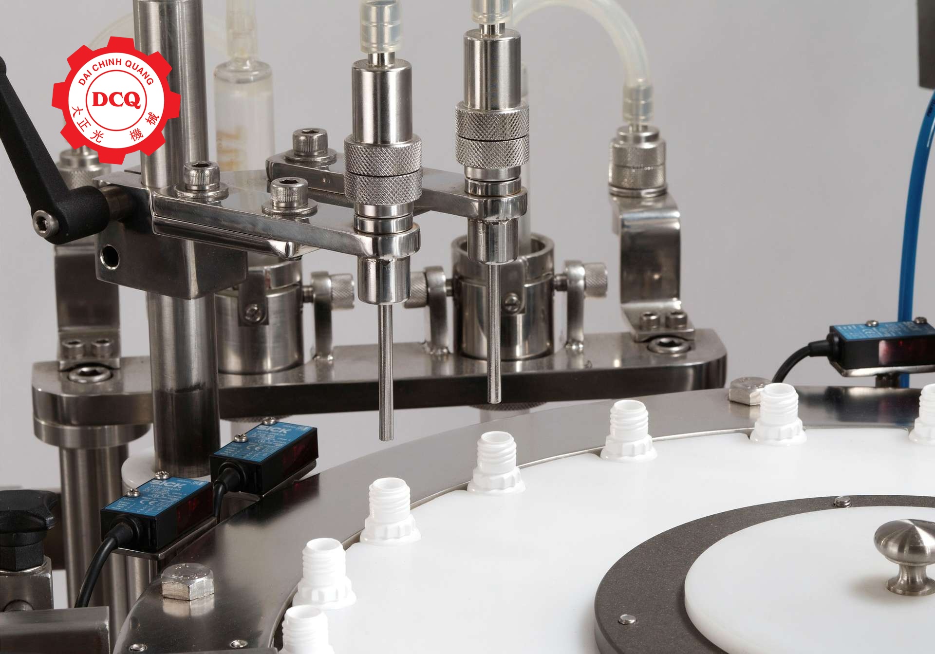 Chiết rót chuẩn xác & Đảm bảo vệ sinh: Hệ thống bơm định lượng với toàn bộ bề mặt tiếp xúc nguyên liệu được chế tạo từ thép không gỉ (Inox) 316L cao cấp. Đầu kim chiết được tích hợp công nghệ chống nhỏ giọt (anti-drip). Máy trang bị cơ cấu kẹp cổ chai giúp định vị chính xác vị trí trước khi đưa kim chiết vào. Cụm chiết rót được thiết kế tối ưu để dễ dàng tháo lắp và vệ sinh, đáp ứng nghiêm ngặt tiêu chuẩn cGMP.